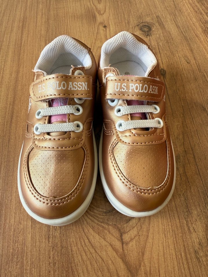 Parlak kahverengi U.S. Polo Assn. kız spor ayakkabısı, cırt cırtlı kapanış. Orjinal hatta etiketi vs vardi kayboldu. Kızım küçükken almıştım ama denediğimiz zaman küçük geldi kızım heveslediği için evde 1 2 kere denedi sadece kendi kendine. Ayakları tombikse olmaz bilginiz olsun