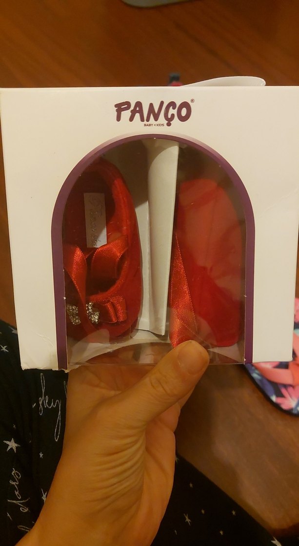 Parlak kırmızı renkte, bantlı kız babetleri. Üzerinde desenler ve PANCO markasına ait.