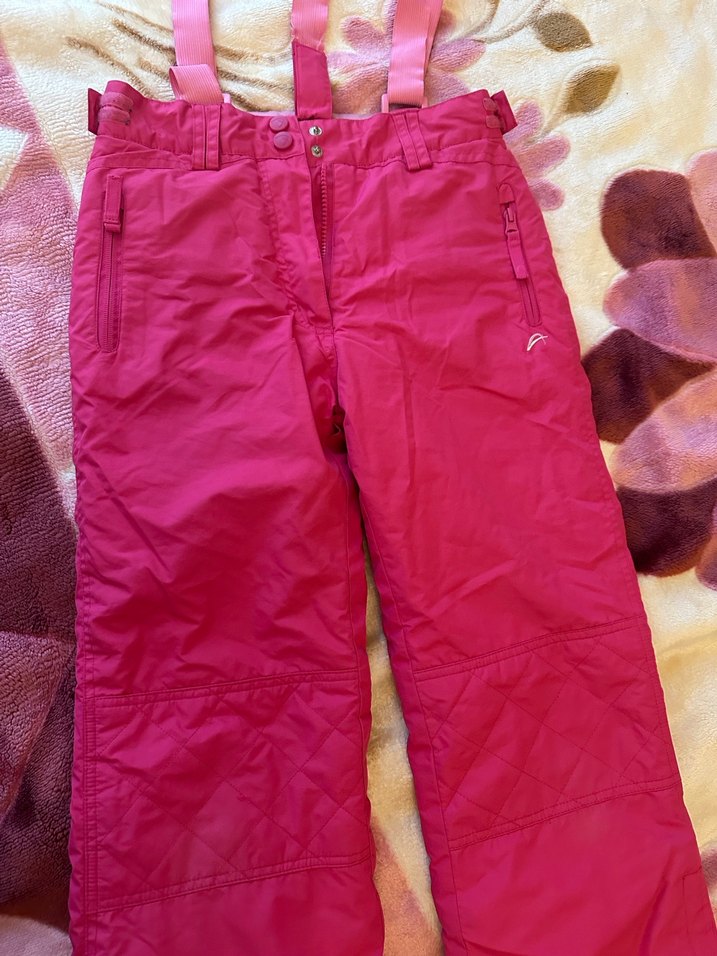Kızlar için parlak pembe fermuarlı cepli, ayarlanabilir askılı, yumuşak ve sıcak kumaştan kayak pantolonu