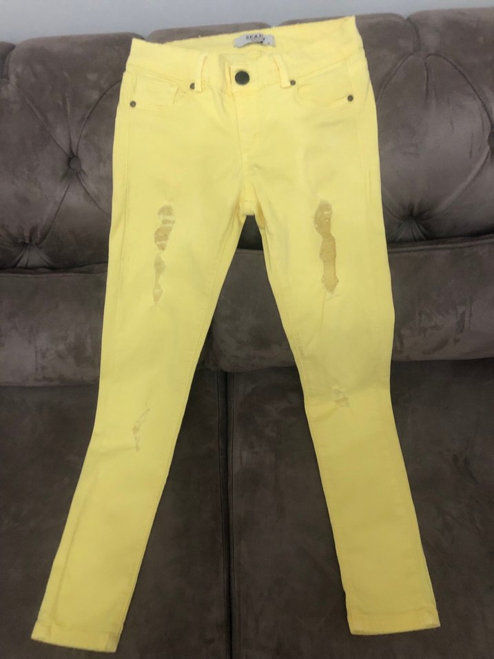 Kızlar için parlak sarı, dar kesim pantolon. Sentetik kumaştan, tokalı ve desensizdir. Sokak modasına uygun. ✨