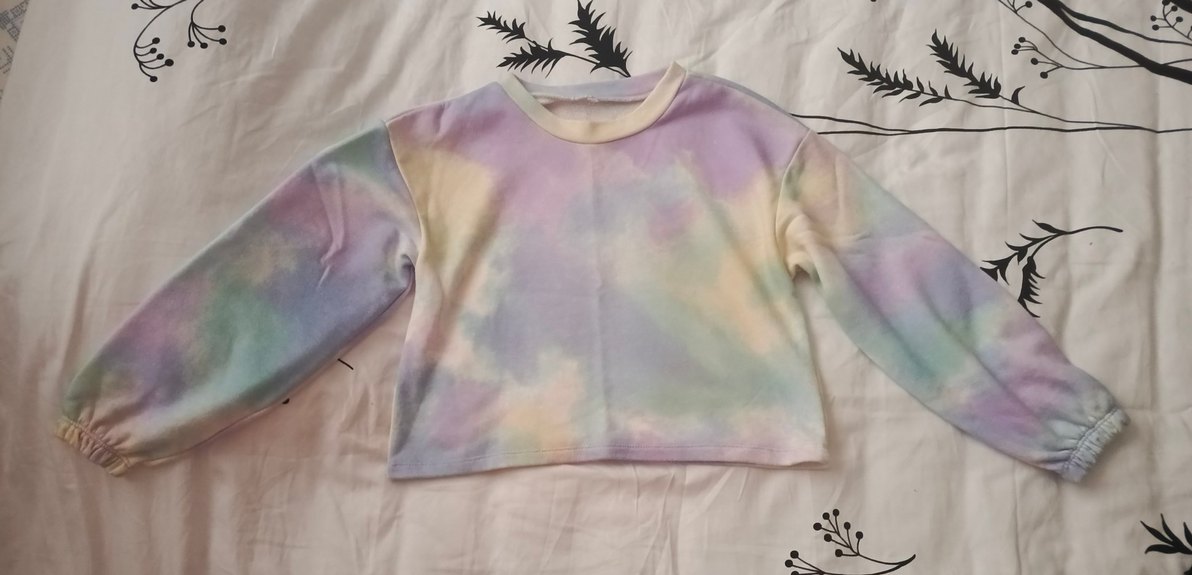 Yumuşak pamuktan, bol kesim, uzun kollu ve bisiklet yaka pastel batik desenli kız tişörtü. Trendy günlük stil için uygundur.