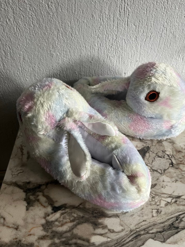 Kızlar için yumuşak peluş ve pastel tie-dye desenli, kürklü tavşan figürlü rahat terlikler. Retro pop kültür tarzında.