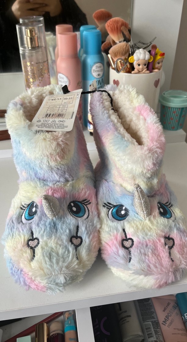 Kızlar için pastel renklerde, peluş ve kürklü unicorn yüz detaylı sıcak terlikler. Rahat ve renkli tasarımıyla dikkat çekiyor.
