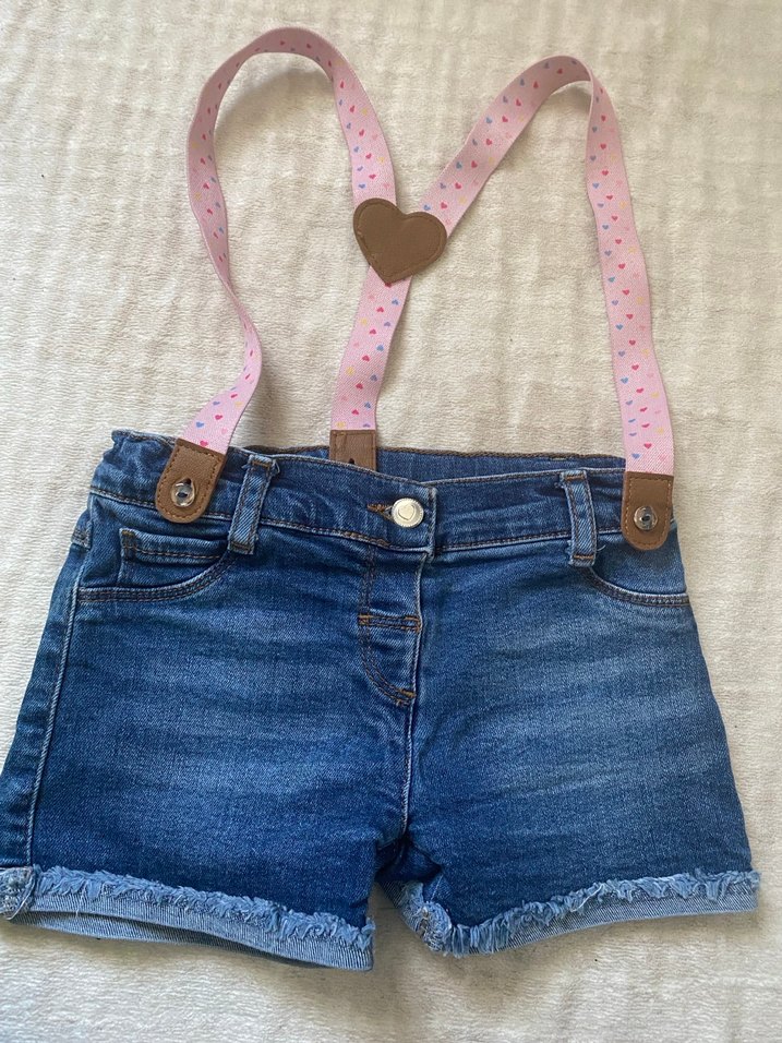 Kızlar için fit kesim kot şort, renkli pembe tokalı askılarla, sokak stili ve rahat görünüm sunar.