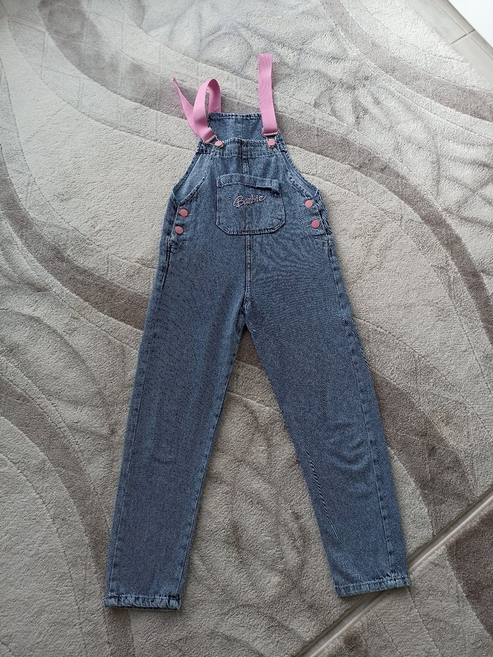 Kızlar için bol kesim kot tulum, pembe bağcıklı askılar ve ön cep detaylı. Bağcıklı tasarım sokak stiline uygun.