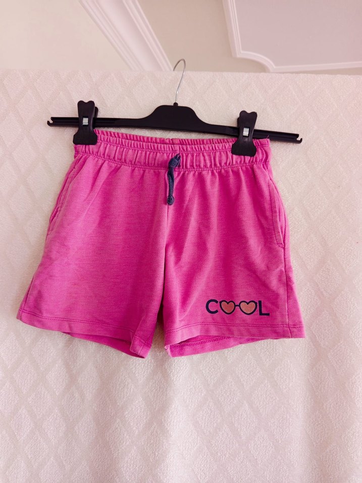Bağcıklı bel ve bağlama deseniyle bol kesim pembe pamuk şort. Bacakta 'COOL' yazısı bulunur, sokak stili için uygun.