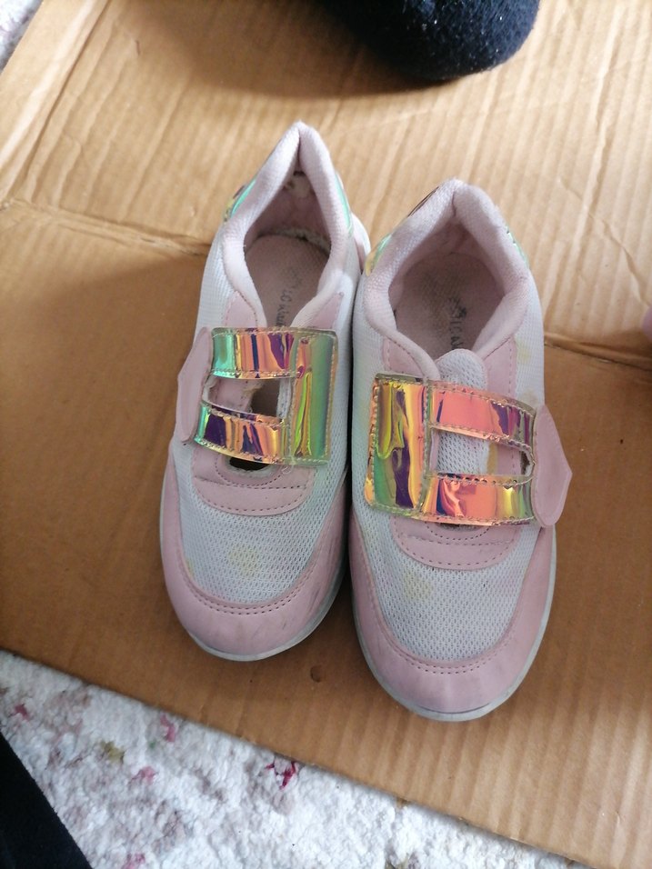 Pembe tonlarında, bağcıksız parlak tokalı bantlarla süslenmiş, kauçuk tabanlı kız çocuk spor ayakkabısı.