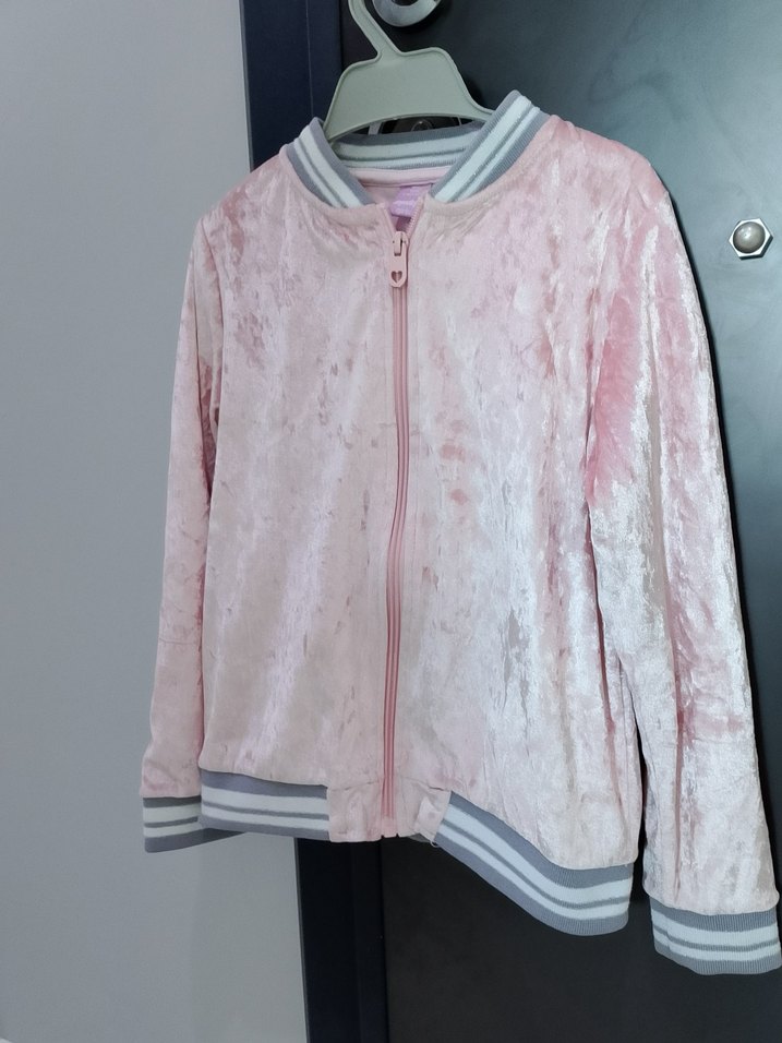 Pembe bağlama desenli, fermuarlı ve yuvarlak yakalı bu bol kesim kız ceketi, sokak modası için yumuşak ve rahat bir dokunuşa sahiptir.