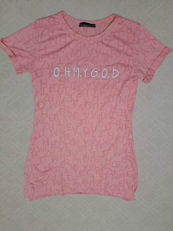Pamuklu, pembe renkli ve baskılı desenli, kısa kollu, yuvarlak yakalı, fitted kesim kız tişörtü. Trendy ve rahat sokak stili sunar.
