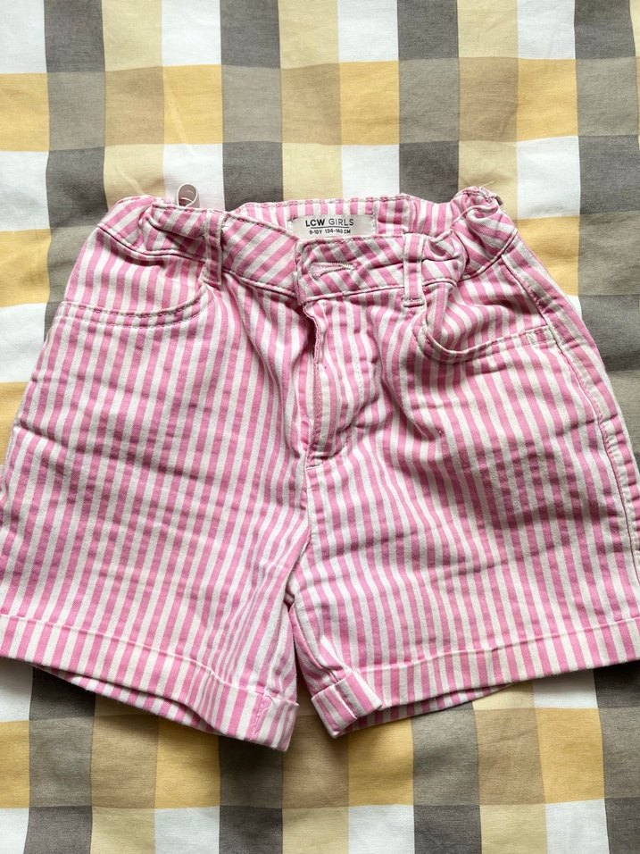 Pastel pembe çizgili, düğmeli cep detaylı, pamuklu kumaştan kızlar için bol kesim şort. Sokak modasına uygun rahat stil sunar. Hiç bir kusuru yoktur