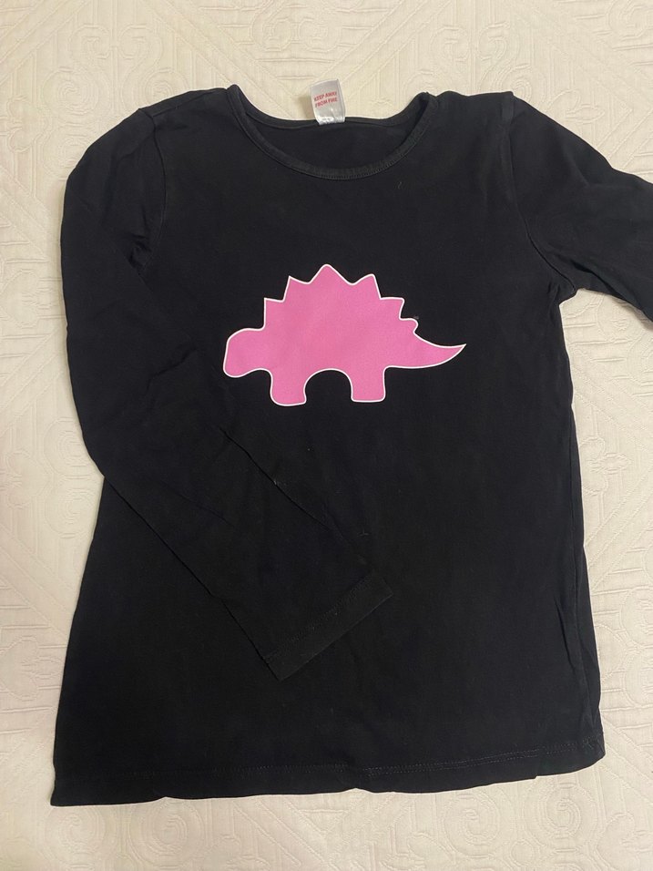 Önü pembe dinozor baskılı, siyah uzun kollu, dar kesim tişört. Yuvarlak yaka ve yumuşak dokulu kumaştan üretilmiştir.