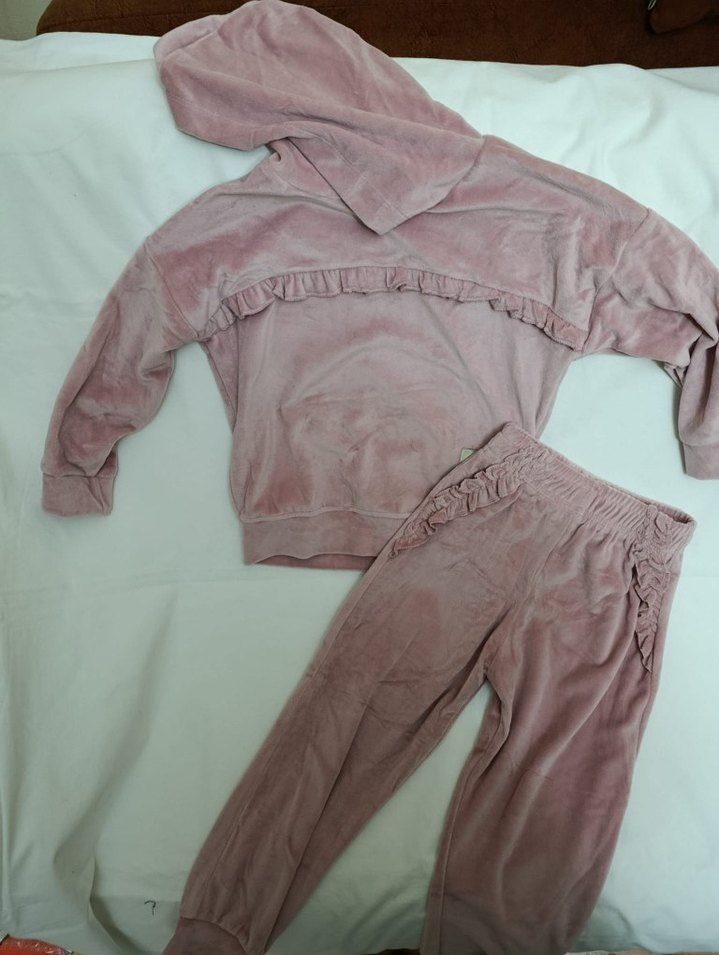 Pembe pastel renkte, yumuşak ve sıcak kumaştan yapılmış, fırfır detaylı bol kesim kız eşofman takımı. Uzun kollu ve bisiklet yaka modeldir. 6-7 yaş
