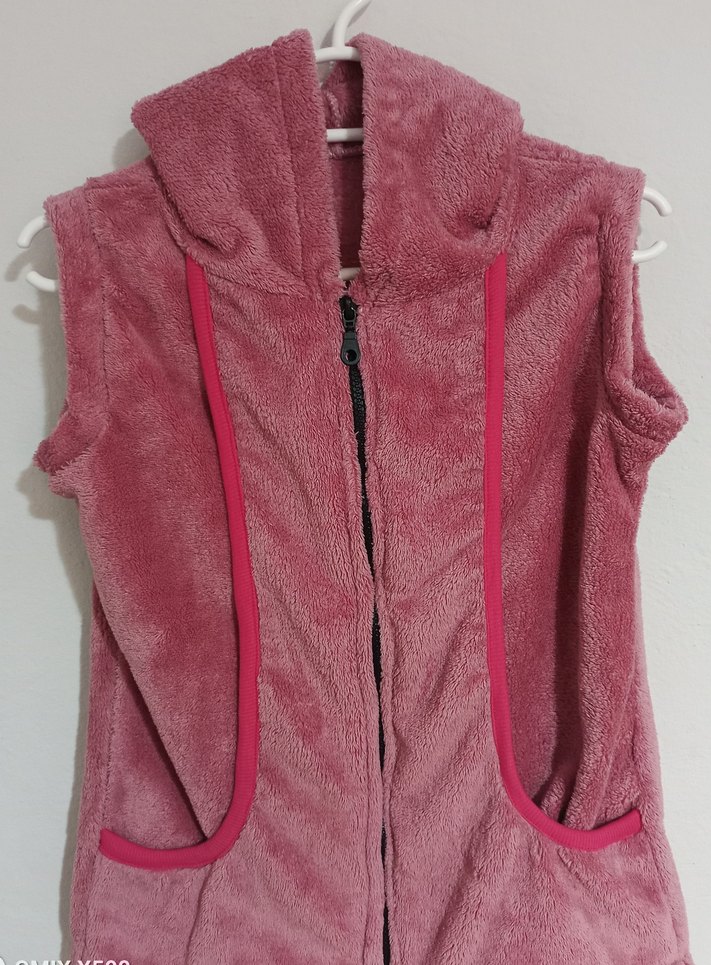 Yumuşak ve sıcak kumaştan yapılmış, pembe kapüşonlu fermuarlı ve kolsuz, dar kesim yelek. Trendy sokak tarzı için uygun.