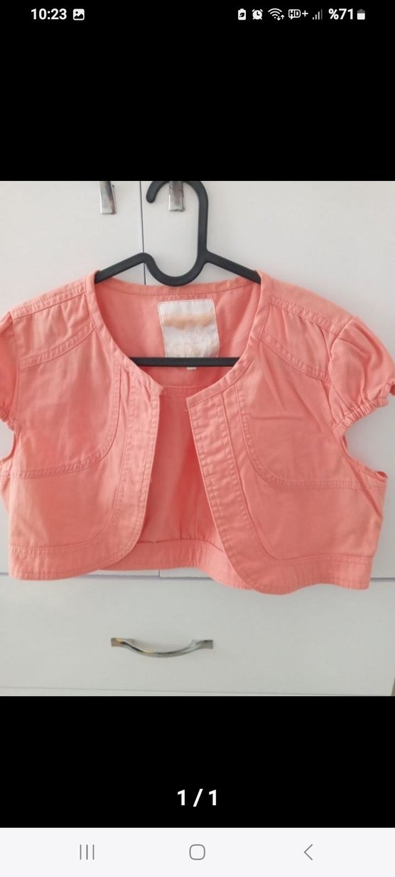 Pembe keten kumaştan yapılmış, düğmeli ve straplez yakalı kız çocuk bolero. Sokak stiline uygun, pastel tonlarda ve fit kesim.