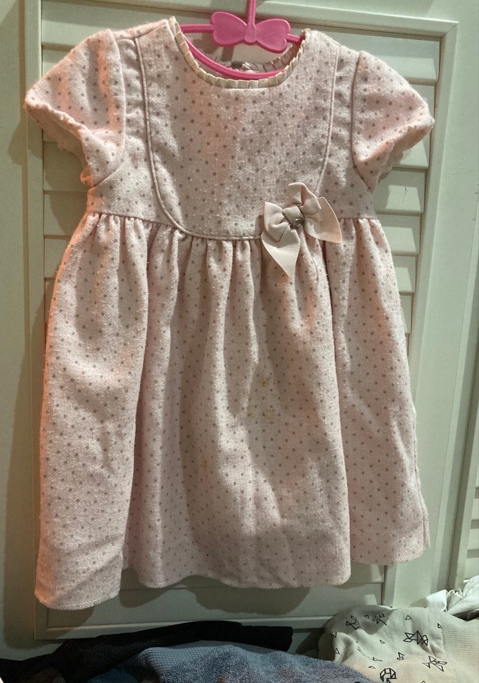 Kızlar için pembe, kısa kollu, nakışlı ve düğmeli, rahat kesimli elbise. Yumuşak ve sıcak kumaştan yapılmıştır. Görünen yerde leke var çıkarılabilir diye düsünüyorum