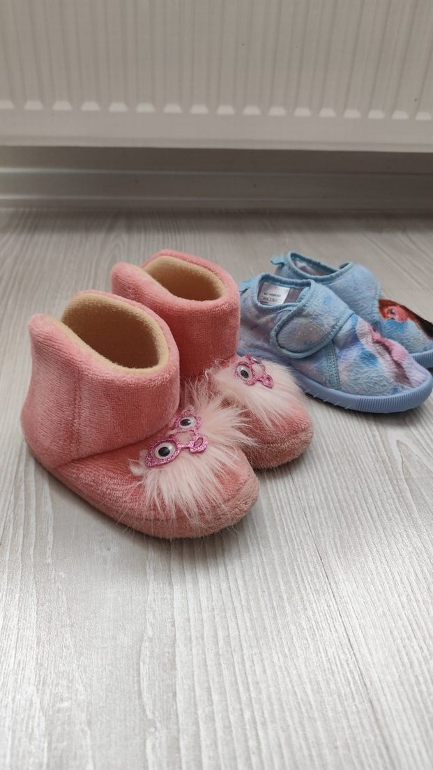 Yumuşak kumaş ve nakışlı kürk detaylara sahip pembe kız çocukları için sıcak terlikler. Rahatlık ve sıcaklık sağlar.