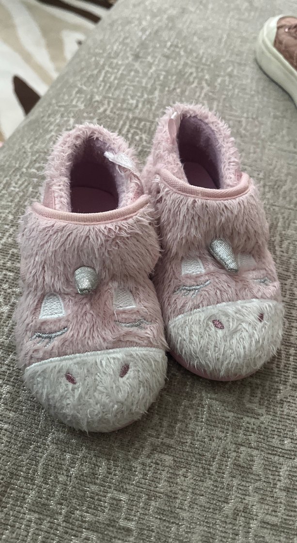 Kızlar için yumuşak pembe kürklü, nakışlı desenlere sahip ev terliği. Pastel normcore tarzda, rahat ve şık.