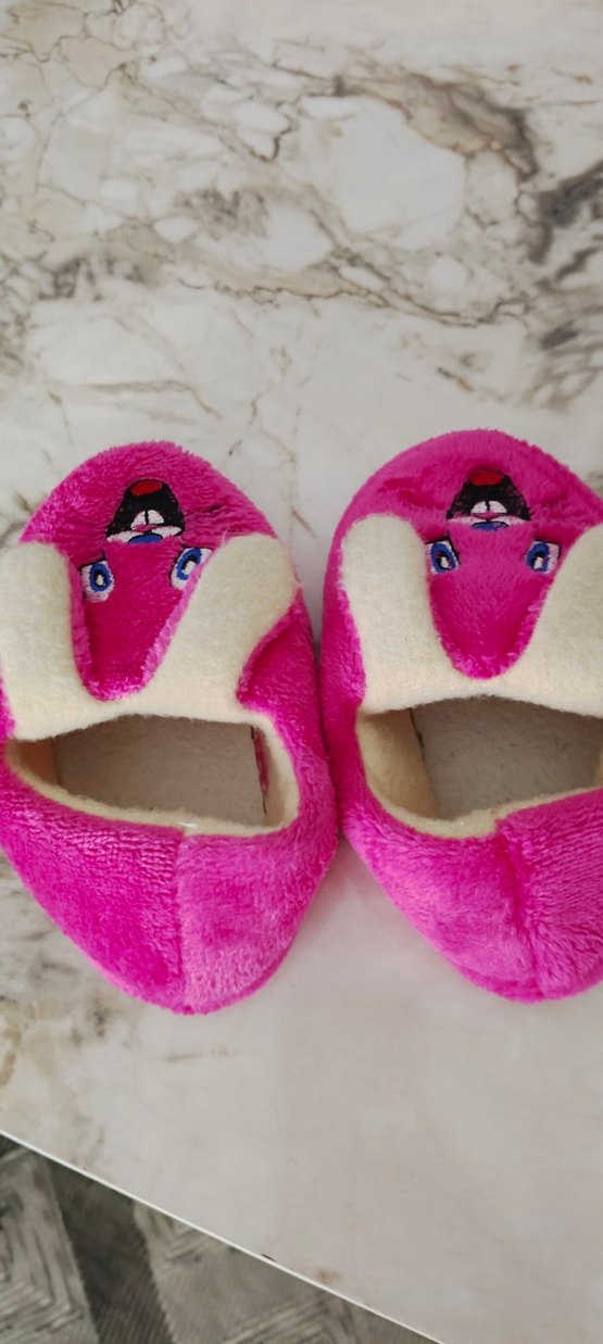 Kızlar için renkli pembe yumuşak kumaş, kürklü detaylar ve nakışlı pop kültür desenlerine sahip sıcak ev terliği.