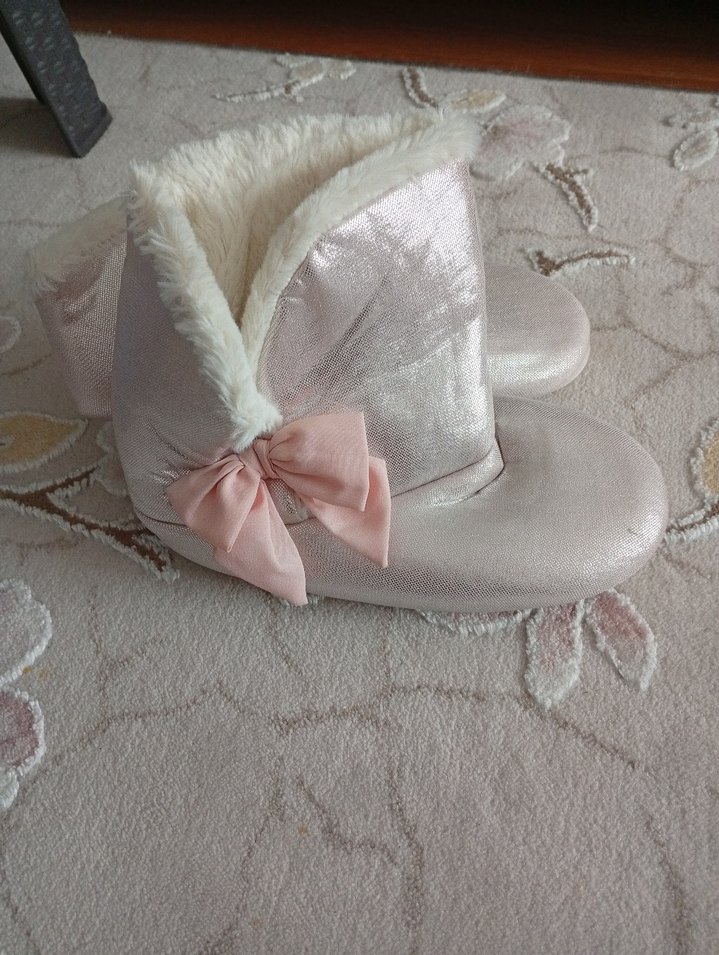 Kızlar için pastel pembe renkte, yumuşak kumaş ve kürk detaylı sıcak ev terliğidir. Klasik tarzda, zarif fiyonk süslemelidir.