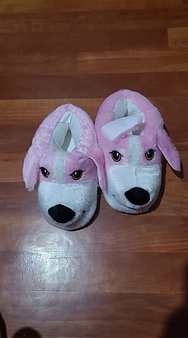 Kızlar için yumuşak ve sıcak pembe terlikler, kürklü köpek detayına sahip. Pastel tonlarda, eğlenceli pop kültür tarzında.