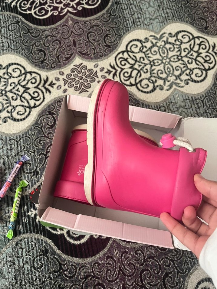 Kızlar için pembe lastik botlar, kolay kullanım sağlayan cırt cırtlı bant içerir. Renkli, sokak modasına uygun, desensiz tasarıma sahiptir.