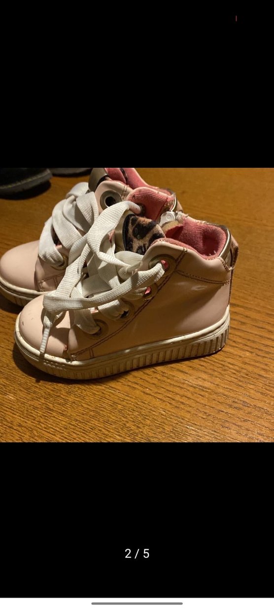Pastel pembe renkli, leopar desenli ve bağcıklı kız çocuk spor ayakkabısı, dayanıklı kauçuk tabanlıdır.