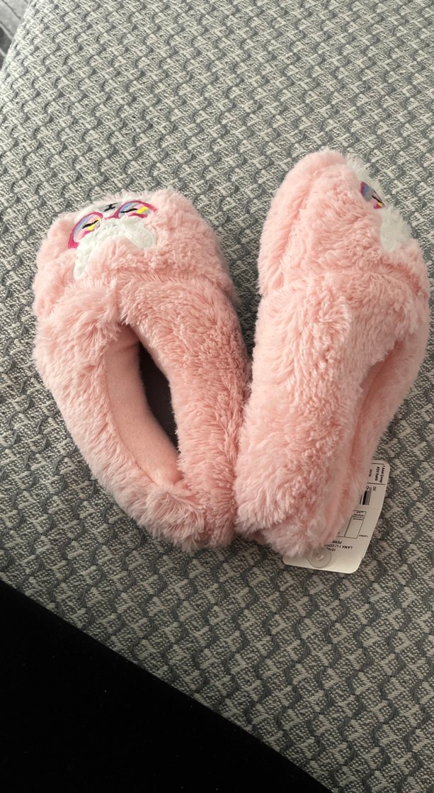 Pastel pembe renkte, kızlar için yumuşak ve sıcak kumaştan, kürk detaylı ve nakışlı desenlere sahip terlikler. 2 ve 4 yaş arası