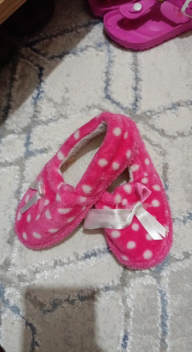 Renkli bağlama desenli, kürk detaylı, yumuşak ve sıcak kumaştan yapılmış pembe kız çocuk terlikleri. Klasik tarzda, kurdele süslemeli.birinin kurdelesi düşmüş