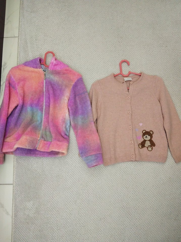 Pembe örgü hırka uzun kollu ve ayıcık desenli, çok renkli pastel tie-dye polar ceket kapüşonlu ve fermuarlı. Her ikisi de bol kesimdir. Tek tek alım yoktur. 2li fiyattır.