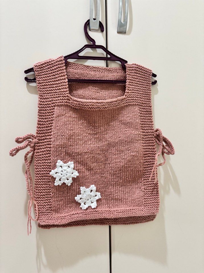 Kızlar için pembe renkli, askısız yaka ve kolsuz örgü yelek. Bol kesim, sade ve bohem tarzda, önünde beyaz örgü çiçek detayları ve yan bağcıkları bulunur.