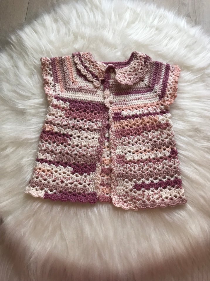Kolsuz, bol kesim ve pastel tonlarda desenli pembe yelek, bohem tarzda örülmüş ve narin bir yaka detayı bulunur. Hafif hava için uygundur.İkili set patik ve yeleği çok şık bebek yeleğidir. 1-2 yaşa uygundur. #tığişi #bebekyeleği #patikyelek #takım