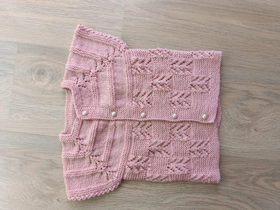 Kızlar için bohem tarzda, inci düğmeli ve zarif örgü desenlere sahip pembe kolsuz örgü hırka.