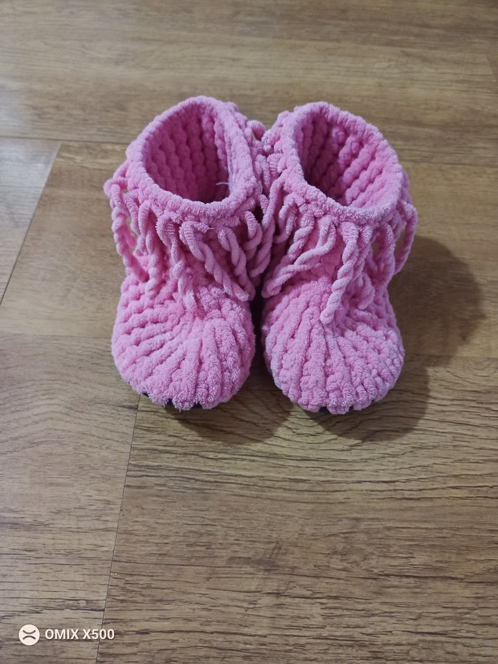 Kızlar için pembe renkte, örgü örme sıcak panduflar, bohem tarzıyla renkli ve rahat bir görünüme sahip.