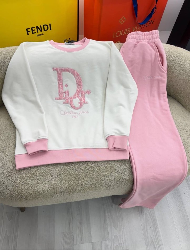 Pamuklu, uzun kollu, yuvarlak yakalı, nakış detaylı pembe-beyaz rahat kesim kız takımı. Sokak stiline uygun, şık ve konforlu bir tasarım.
