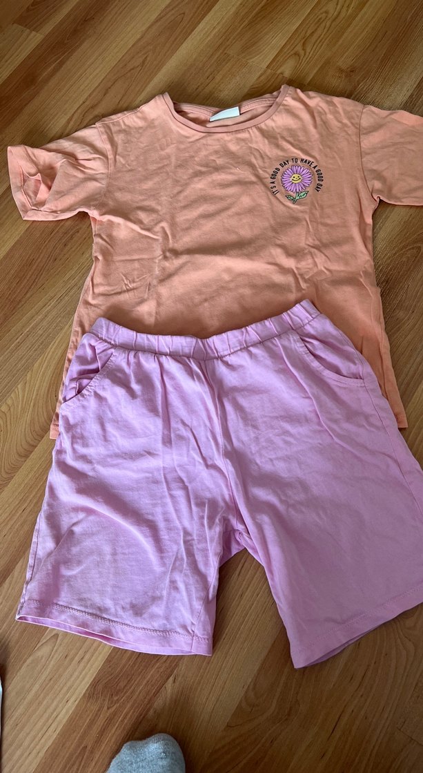 Gevşek kesim, pastel pembe kısa kollu yuvarlak yaka tişört ve açık pembe pamuklu şorttan oluşan rahat kız çocuk takımı. Sokak modasına uygun.