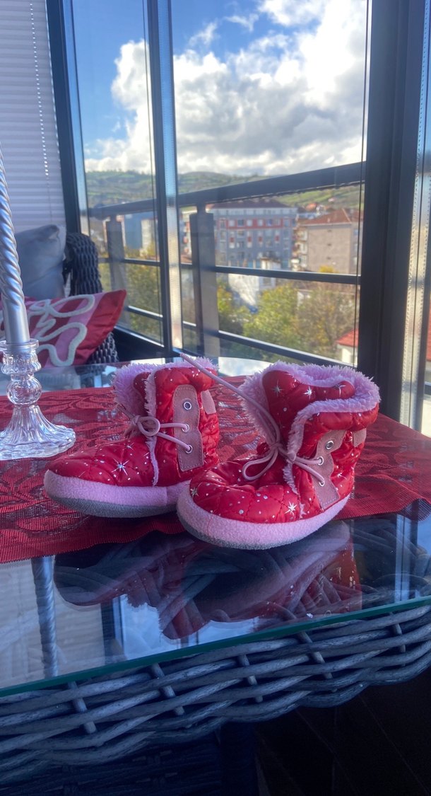 Kızlar için pembe, parlak simli, bağcıklı ve yumuşak astarlı ev terlikleri 19 20 numara içi yünlü sıcacık tutar tertemizdir