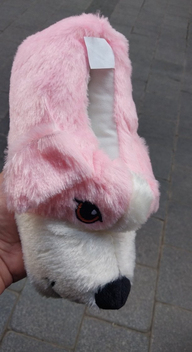 Pastel pembe renkli, peluş detaylı ve kopek desenli kız pandufu, rahatlığı ve şıklığı bir arada sunar.