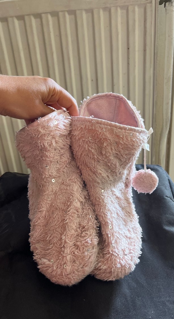 Kızlar için pembe renkte, peluş ve kürk detaylı, ponponlu sıcak ev terlikleri.