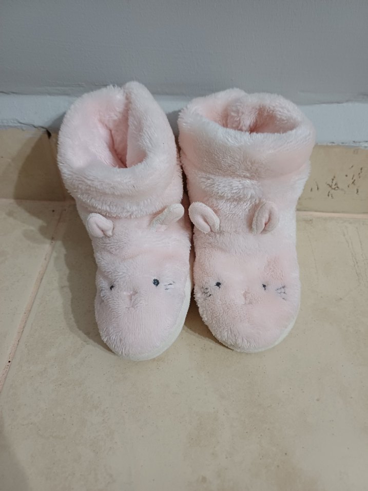 Kızlar için pastel pembe renkte, yumuşak ve sıcak kumaşlı, kürk detaylı ve nakış işlemeli ev terliği. Rahat ve trend bir stil sunar.
