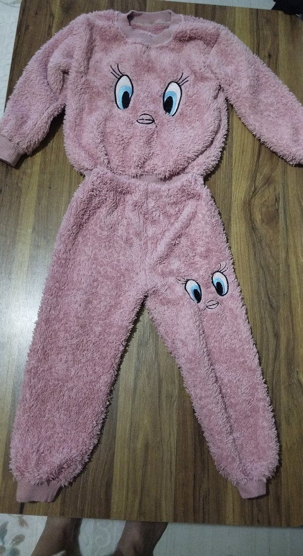 Pembe peluş kumaştan, nakışlı çizgi film yüz detaylı, bol kesim uzun kollu ve yuvarlak yakalı kız çocuk eşofman takımı. 6 yaş ürün fakat 105cm 4 buçuk yaş kızıma kısa oluyor boyu sizde ona göre siparis verin.Simdiden güzel günlerde giyilsn⭐