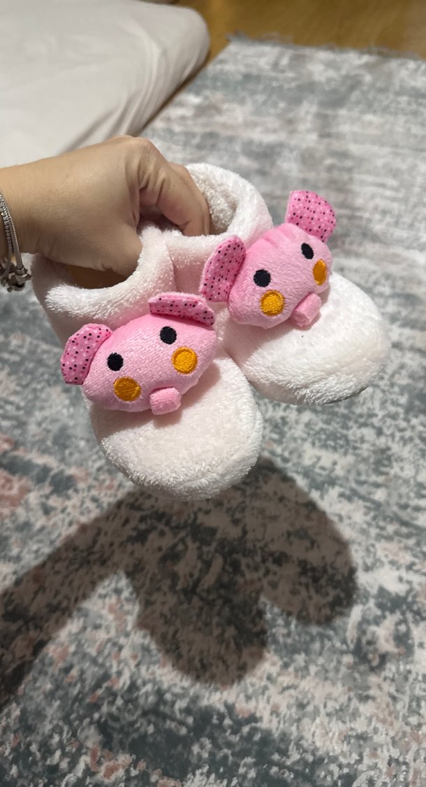 Kızlar için yumuşak peluş kumaştan, renkli nakışlı pembe ayıcık detaylı, içi kürklü sıcak ev terliği. 23-24 numara hiç kullanılmadı