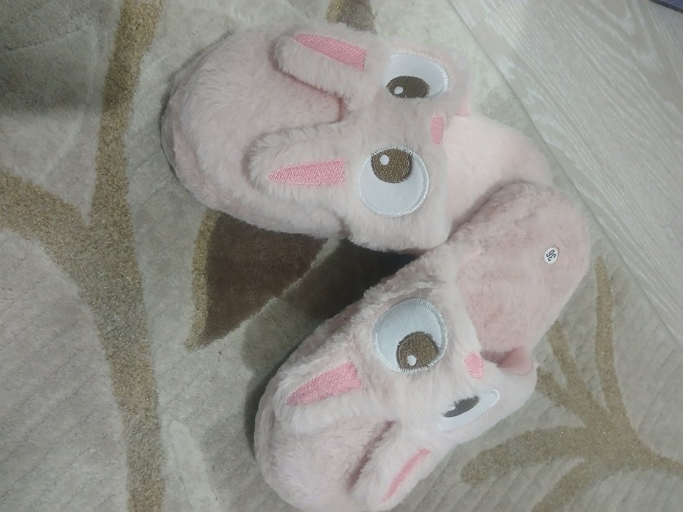 Kızlar için pembe peluş ev terliği, nakışlı tavşan yüzü ve kürk detaylı, rahat ve şık bir tercih.