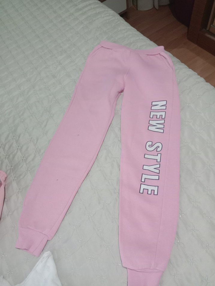 Pembe renkli, yumuşak kumaşlı kızlar için bol kesim eşofman altı. Elastik bel ve üzerinde 'NEW STYLE' baskısı bulunur. son resimde göründüğü gibi kucuk lekesi mevcut
