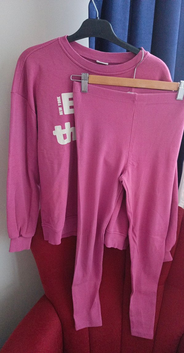 Pembe renkli, bol kesim sweatshirt ve eşofman altı takımı, yuvarlak yaka ve uzun kollu, yumuşak ve sıcak kumaştan üretilmiş, rahat ve şık görünüm sunar.
