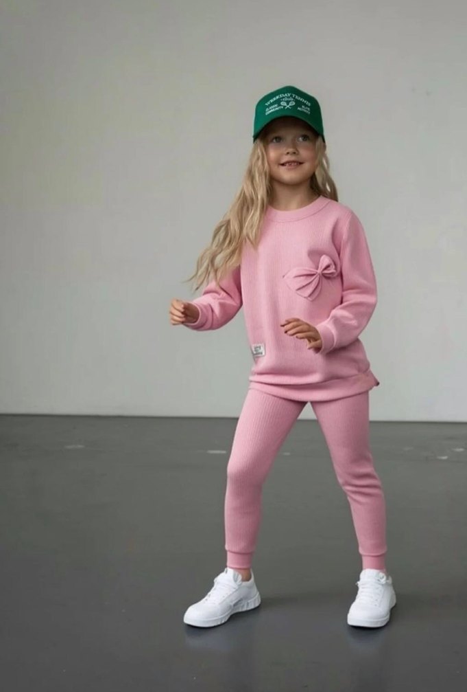 Pastel pembe renkli, bol kesim kız eşofman takımıdır. Uzun kollu ve bisiklet yaka, yumuşak ve sıcak kumaştan yapılmıştır, rahat ve şık bir görünüm sunar.