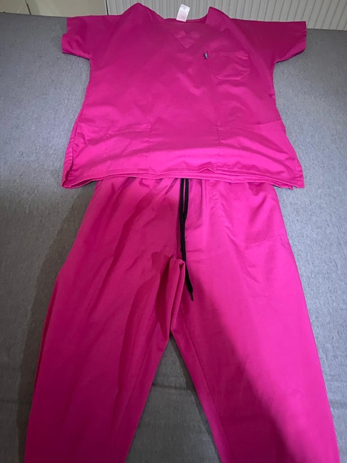 Kızlar için koyu pembe renkte, sentetik kumaştan, rahat kesim hemşire forması .