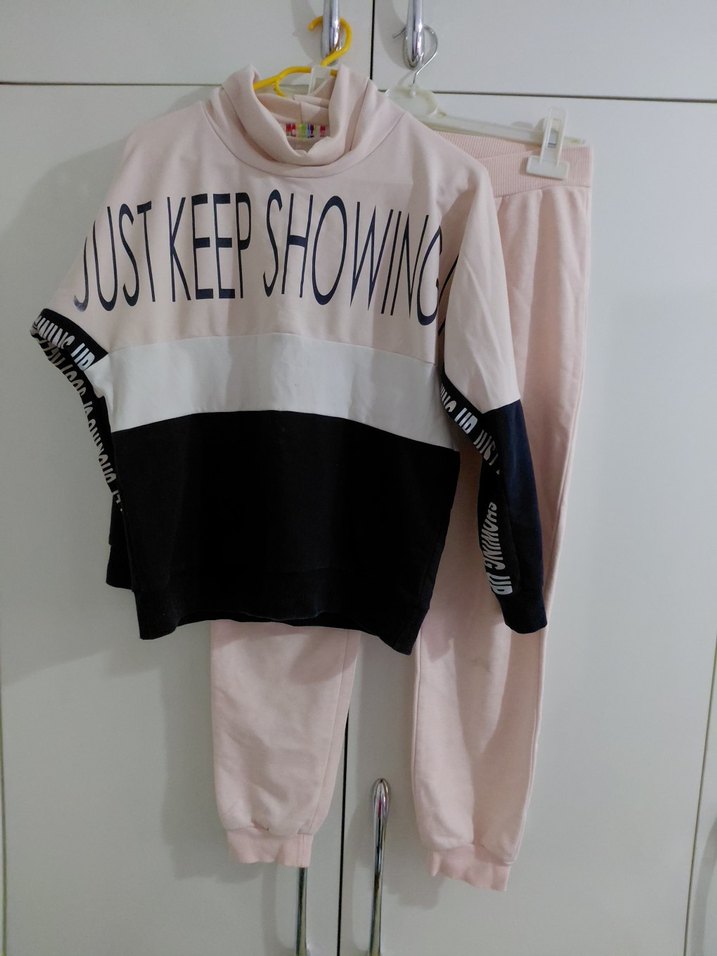 Kızlar için bol kesim, uzun kollu ve bisiklet yaka eşofman takımı. Pastel pembe renk, baskılı yazı ve örme detaylarla, yumuşak sentetik kumaştan üretilmiştir. ♀️