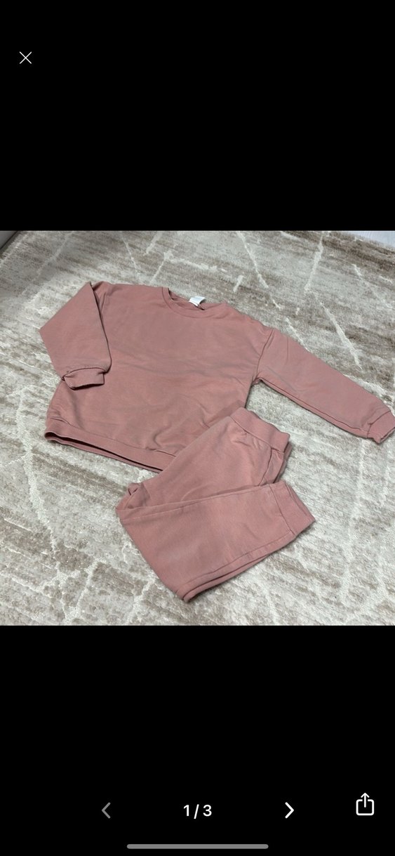 Pembe pastel renkte, bol kesim, yuvarlak yakalı sweatshirt ve eşofmandan oluşan, yumuşak ve sıcak kumaştan kız çocuk takımı.
