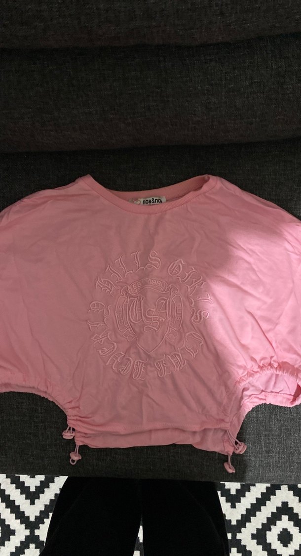 Pembe pastel renkli, yuvarlak yakalı ve kısa kollu kız tişörtü. Keten kumaştan, bol kesim ve baskılı, fırfır detaylı, sokak stili için uygun.
