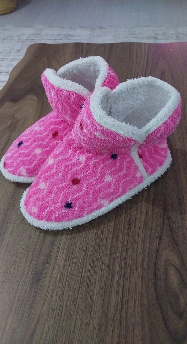 Kızlar için örgü pembe dış yüzey ve renkli nakış detaylara sahip, yumuşak iç astarlı sıcak terlikler. Rahat ve şık kullanım için uygundur.